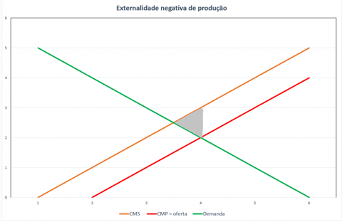 Para uma externalidade negativa, o custo social total de um bem é maior do que o custo privado percebido, o que sugere que a curva de oferta social (que reflete os custos totais da produção, incluindo externalidades negativas) estará à esquerda da curva de oferta privada, porque considera os custos externos.