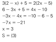 Resolva cada uma das equações a seguir. a) 3(2- x) + 5 = 2(2x - 5)