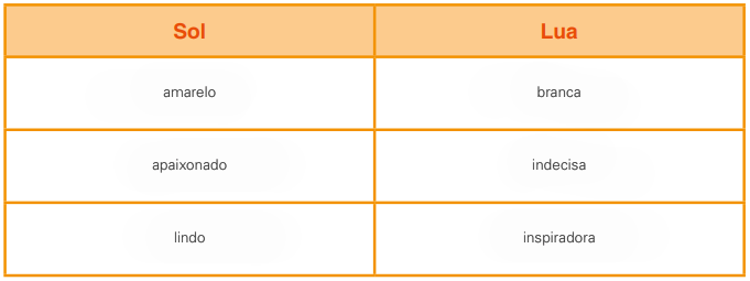 A letra de canção que você leu conta uma história que envolve o Sol e a Lua. No quadro abaixo, quais palavras podem ser relacionadas ao Sol e quais podem ser relacionadas à Lua? Copie-as nas colunas corretas.