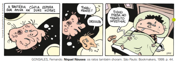 Leia a tirinha do personagem Calvin sobre alimentação. Depois, marque a única alternativa que descreve corretamente a situação mostrada.