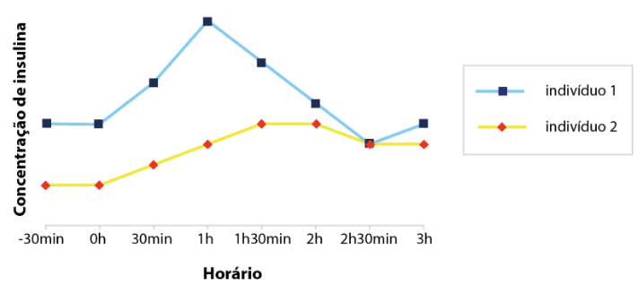 Considere dois indivíduos de mesma idade, peso, gênero e altura que fazem ingestão da mesma quantidade de glicose no tempo 0h. O gráfico demonstra a concentração de insulina em sua corrente sanguínea medida de meia hora da ingestão, na ingestão e em intervalos de meia hora após a ingestão.