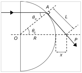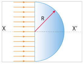 A figura a seguir, esquematiza uma lente esférica plano-convexa, imersa no ar, de eixo óptico XX’, raio R e feita de material que possui índice de refração n. Um pincel de luz cilíndrico atinge normalmente sua face plana cobrindo-a completamente.
