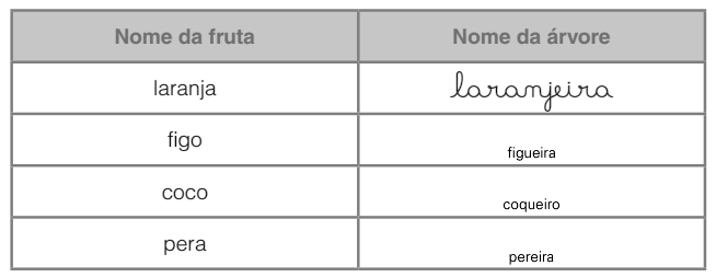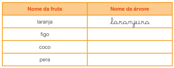 b) É muito comum que as árvores frutíferas tenham o nome formado com base no nome da fruta que produzem. Veja o exemplo no quadro abaixo: